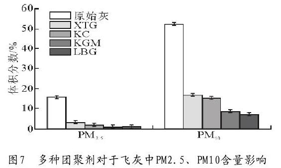 通過圖7可見,添加多種團聚劑后,飛灰粒物中PM2.5和PM10分別都有不同程度的減少,其中團聚劑LBG效果較顯著,團聚劑KGM其次。
