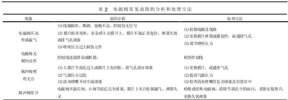 在除塵器的日常運行中,由于運行條件會發(fā)生某些改變,或者出現(xiàn)某些故障,都將影響設備的正常運轉狀況和工作性能,要定期地進行檢查和適當?shù)恼{節(jié),降低動力消耗及回收有用的物料。 同時,特別要堵住除塵器排灰口的漏風,因為在除塵器的灰斗中有大量緩慢下落的粉塵, 逆流向上的漏風氣流又造成下落粉塵的二次飛揚及多次循環(huán), 因而排灰口漏風可使除塵器內的粉塵濃度成倍地高于入口的粉塵濃度, 這樣_惡化了除塵器的工作條件,影響了除塵效率[5] 。 除塵器常見故障的分析及處理方法見表 1,電磁閥常見故障的分析和處理方法見表 2。