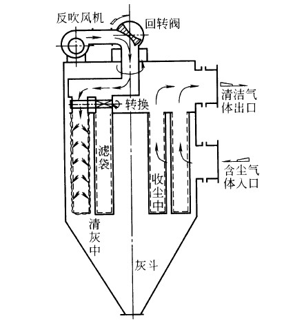脈沖反吹清灰布袋除塵器形式是對前述反映清灰方式的反向氣流給予脈動動作的清灰方式,它具有較強的清灰作用,但要有能產生脈動作用的機械結構(如自動開、閉閥門等)。由于清灰作用較強,如采取部分濾袋逐次清灰時,則不需要分室結構形式。